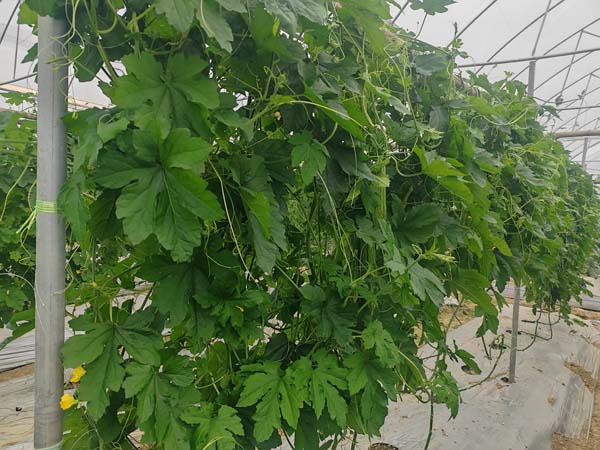 长势健壮;深绿色油瓜,果长约30-32cm,果宽约6.7cm,果肉厚约1.3cm;单果重约565克。