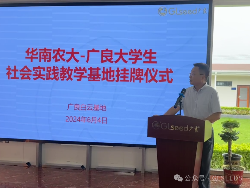 紧接着,广良总经理郭少龙发表讲话,感谢华南农大对广良公司的信任与支持,表示广良公司将全力支持实践教学基地的建设与发展,并通过实践教学基地的建立,希望为学生提供更多实践机会,也为广良公司注入新的活力和创新力。